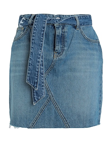 denim, faded, brand logo, belt, solid color, medium wash, belt loops, zipper fastening, fringed cuffs, five pockets, pencil skirt