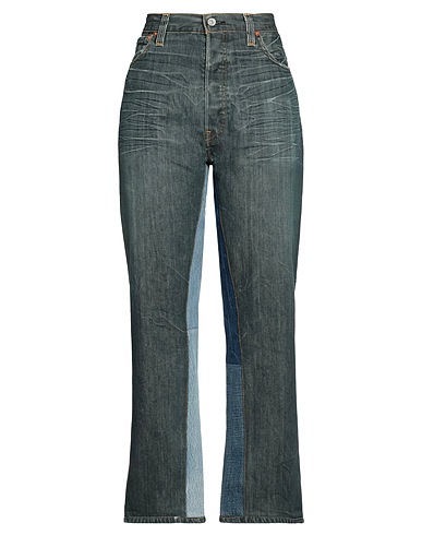 denim, faded, brand logo, solid color, dark wash, high waisted, tapered leg, button fastenings, multipockets, small sized, tapered model