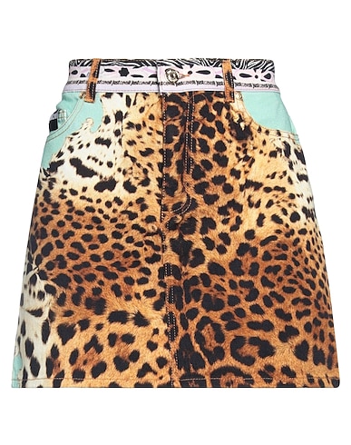 denim, leather trims, brand logo, leopard-print, colored wash, belt loops, zipper fastening, 1 button, five pockets, stretch, contains non-textile parts of animal origin, flared skirt