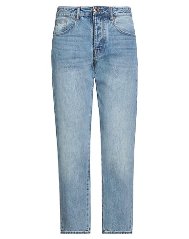 tapered jeans, denim, distressed, faded, solid color, brand logo, leather trims, medium wash, mid rise, belt loops, tapered leg, regular fit, 1 button, five pockets, contains non-textile parts of animal origin