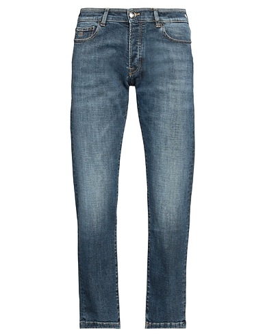 straight-leg jeans, denim, faded, stretchy fabric, solid color, brand logo, leather trims, medium wash, mid rise, belt loops, button fastenings, five pockets, machine wash or dry clean, do not bleach, tumble dry, contains non-textile parts of animal origin