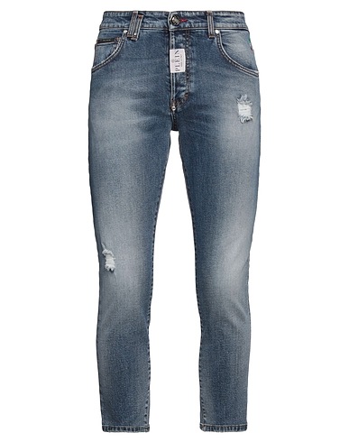 skinny jeans, denim, faded, distressed, solid color, brand logo, leather trims, medium wash, mid rise, tapered leg, slim fit, button fastenings, five pockets, machine wash, do not bleach, do not tumble dry, contains non-textile parts of animal origin