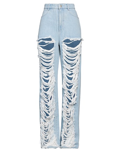 denim, distressed, leather trims, brand logo, solid color, light wash, high waisted, regular fit, zipper fastening, button fastenings, multipockets, dry clean, do not bleach, do not tumble dry, contains non-textile parts of animal origin, straight-leg jeans