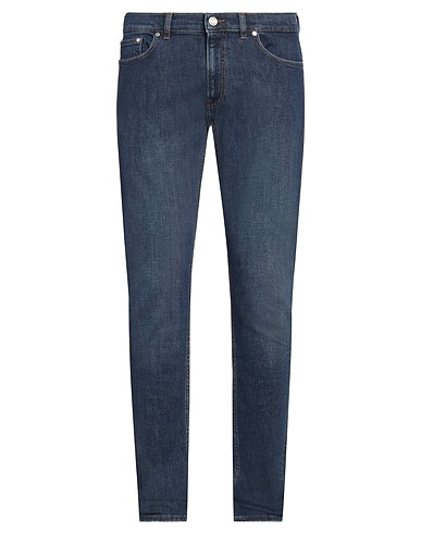 straight-leg jeans, denim, faded, solid color, brand logo, dark wash, mid rise, slim fit, 1 button, zipper fastening, five pockets, do not dry clean, do not bleach, tumble dry