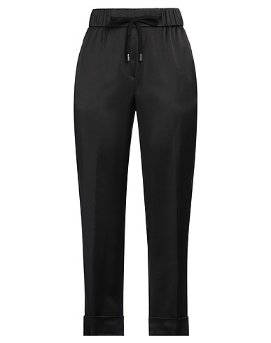 tapered pants, satin, stretchy fabric, solid color, embellished, high waisted, elasticized waist, regular fit, drawstring fastening, folded hem, welt pockets, slit pockets, dry clean, do not bleach, do not tumble dry