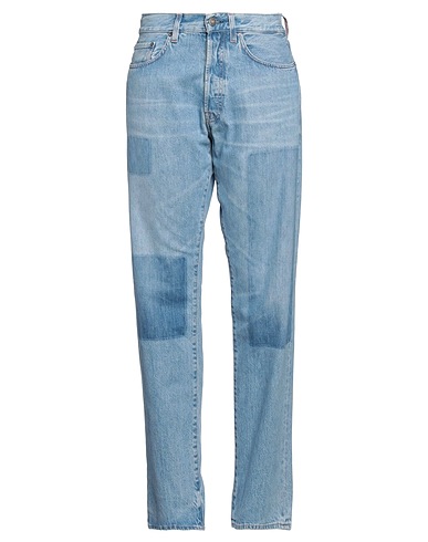 straight-leg jeans, denim, faded, patchwork, brand logo, light wash, high waisted, belt loops, regular fit, button fastenings, multipockets, machine wash or dry clean, do not bleach, do not tumble dry, contains non-textile parts of animal origin