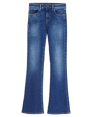 flared jeans, denim, brand logo, solid color, dark wash, high waisted, belt loops, regular fit, button fastenings, zipper fastening, multipockets, stretch, machine wash, do not bleach, do not tumble dry