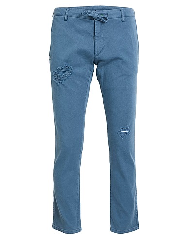 tapered jeans, denim, distressed, stretchy fabric, solid color, no appliqués, colored wash, low waisted, drawstring waist, regular fit, zipper fastening, 1 button, five pockets, machine wash or dry clean, do not bleach, tumble dry, cropped