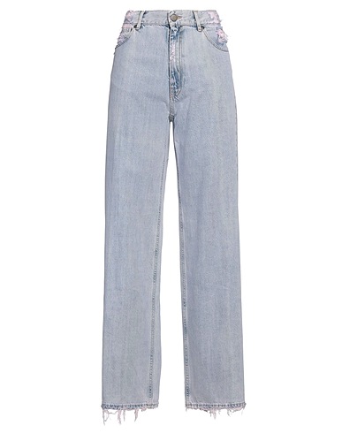 straight-leg jeans, denim, distressed, brand logo, solid color, medium wash, high waisted, belt loops, regular fit, zipper fastening, multipockets, machine wash, do not bleach, do not tumble dry