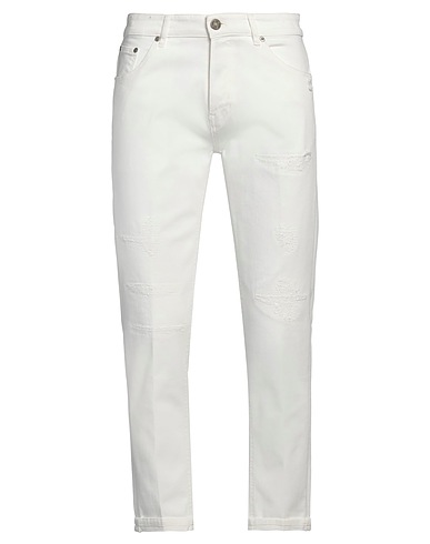 tapered jeans, denim, distressed, stretchy fabric, solid color, brand logo, colored wash, mid rise, regular fit, button fastenings, folded hem, five pockets, machine wash, do not bleach, do not tumble dry