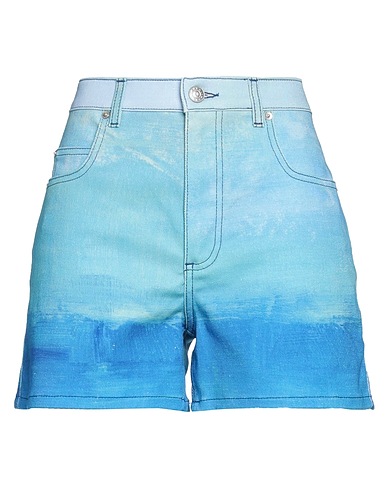 shorts, denim, stretchy fabric, tie-dyed, leather trims, brand logo, colored wash, high waisted, 1 button, zipper fastening, five pockets, machine wash or dry clean, do not bleach, do not tumble dry, contains non-textile parts of animal origin, this brand runs large, planning a weekend getaway or beach vacation? this is the effortless summer style you need