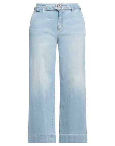 wide-leg jeans, denim, faded, stretchy fabric, solid color, brand logo, belt, light wash, high waisted, regular fit, zipper fastening, 1 button, pockets, machine wash or dry clean, do not bleach, do not tumble dry, cropped