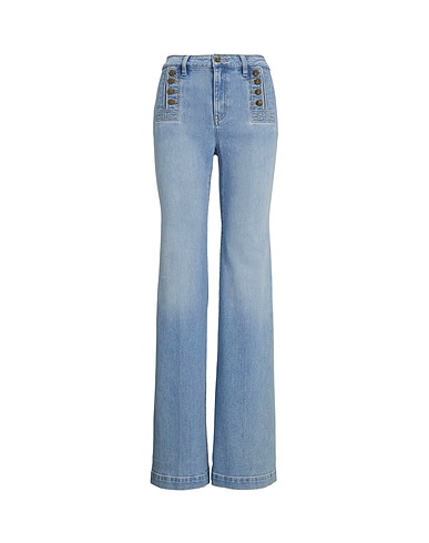flared jeans, denim, faded, solid color, brand logo, medium wash, high waisted, regular fit, zipper fastening, 1 button, multipockets, machine wash, tumble dry