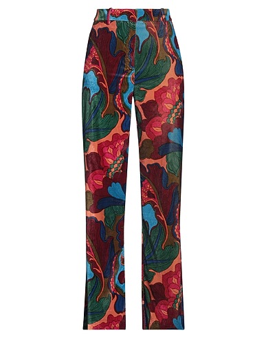 flared pants, velvet, floral-print, no appliqués, high waisted, belt loops, regular fit, button fastenings, hook fastenings, multipockets, machine wash or dry clean, do not bleach, do not tumble dry