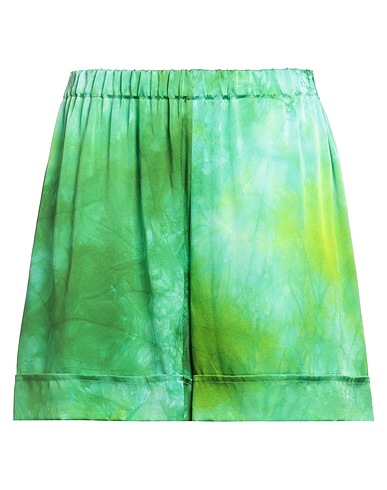 shorts, satin, tie-dyed, no appliqués, elasticized waist, folded hem, dry clean, do not bleach, do not tumble dry