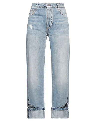 boyfriend jeans, denim, distressed, faded, solid color with appliqués, brand logo, crystals, light wash, high waisted, belt loops, regular fit, button fastenings, folded hem, pockets, machine wash, do not bleach, do not tumble dry, contains non-textile parts of animal origin