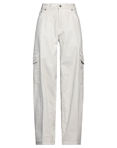cargo jeans, denim, solid color, brand logo, colored wash, high waisted, regular fit, 1 button, zipper fastening, pockets, machine wash or dry clean, do not bleach, tumble dry