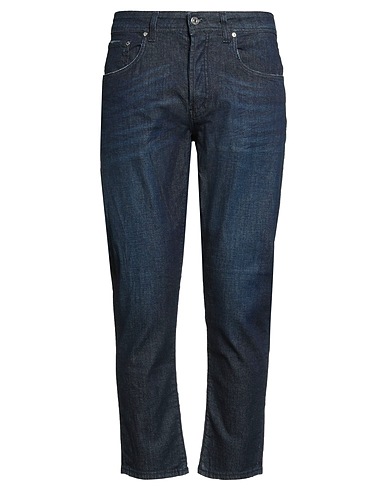 straight-leg jeans, denim, faded, distressed, stretchy fabric, solid color, brand logo, embellished, dark wash, mid rise, regular fit, button fastenings, five pockets, machine wash or dry clean, do not bleach, do not tumble dry, cropped