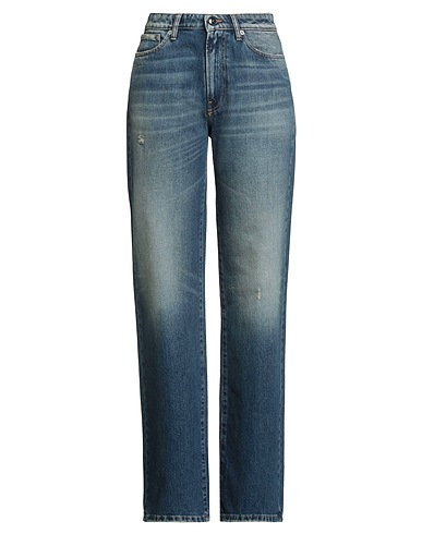 straight-leg jeans, denim, distressed, faded, solid color, brand logo, medium wash, high waisted, regular fit, zipper fastening, multipockets, hand wash or dry clean, do not bleach, do not tumble dry