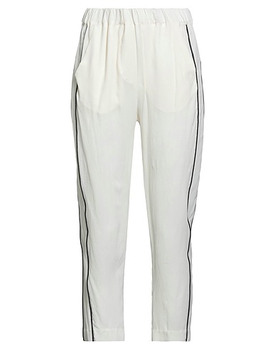 tapered pants, woven, solid color, piped trims, high waisted, elasticized waist, relaxed fit, slit pockets, machine wash or dry clean, do not bleach, do not tumble dry, cropped