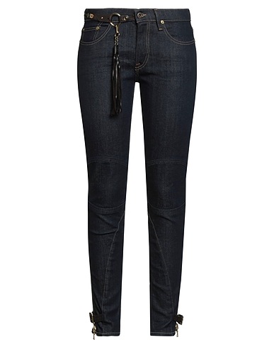 skinny jeans, denim, stretchy fabric, solid color with appliqués, leather trims, dark wash, mid rise, belt loops, regular fit, 1 button, zipper fastening, zips at hem, multipockets, machine wash or dry clean, do not bleach, do not tumble dry, contains non-textile parts of animal origin