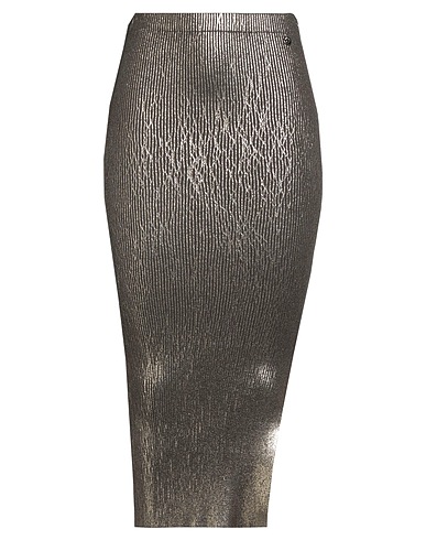 pencil skirt, knitted, metallic, lightweight knit, stretchy fabric, solid color, no appliqués, unlined, side slit, hand wash, do not bleach, do not tumble dry