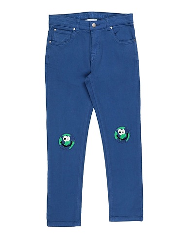 denim, stretchy fabric, solid color with appliqués, embellished, brand logo, colored wash, mid rise, belt loops, tapered leg, regular fit, zipper fastening, five pockets, machine wash, do not bleach, tumble dry