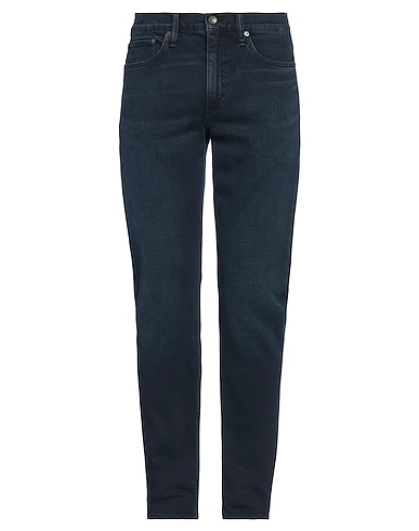 tapered jeans, denim, faded, solid color, embroidered logo, dark wash, mid rise, belt loops, slim fit, zipper fastening, 1 button, slit pockets, patch pockets, machine wash, do not bleach, do not tumble dry