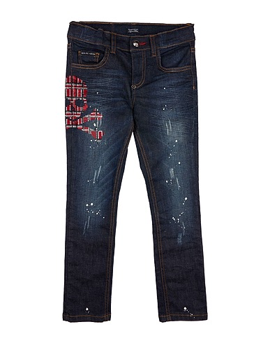 denim, distressed, stretchy fabric, solid color with appliqués, crystals, brand logo, dark wash, zipper fastening, five pockets, hand wash, do not bleach, do not tumble dry