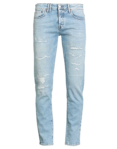 straight-leg jeans, denim, distressed, faded, solid color, brand logo, medium wash, mid rise, regular fit, button fastenings, five pockets, machine wash or dry clean, do not bleach, do not tumble dry