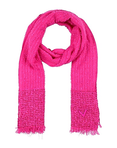scarf, knitted, metallic, lightweight knit, solid color, brand logo, fringes, dry clean, do not bleach, do not tumble dry
