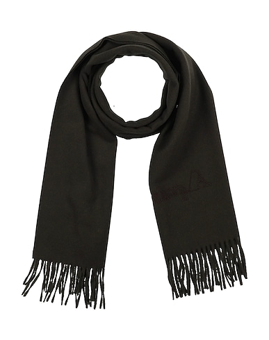 scarf, flannel, solid color with appliqués, embroidered logo, fringes, dry clean, do not bleach, do not tumble dry