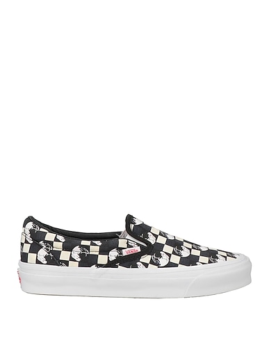slip on, canvas, checked, brand logo, fabric inner, round toe, rubber cleated sole