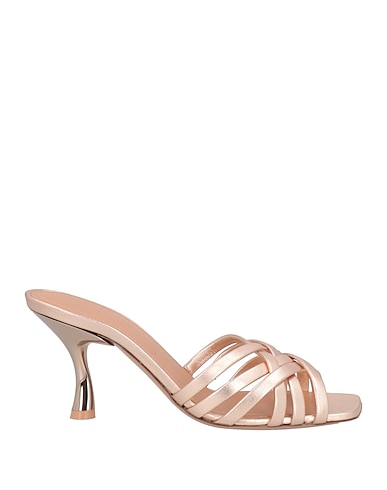 slide sandals, leather, metallic, solid color, no appliqués, leather lining, square toe, spike heel, leather sole, contains non-textile parts of animal origin, small sized