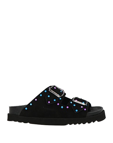 technical sandals, suede, solid color with appliqués, crystals, brand logo, leather lining, buckle fastening, round toe, flat, rubber cleated sole, contains non-textile parts of animal origin