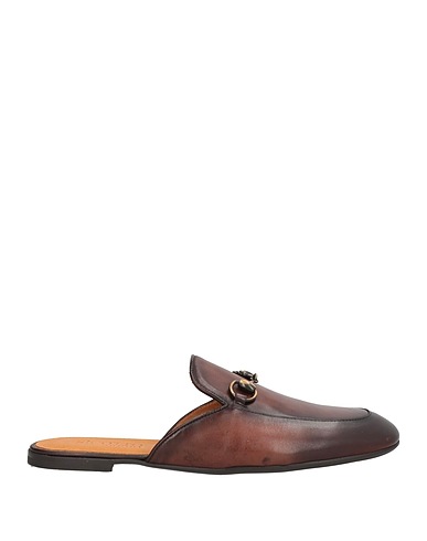 mules, leather, solid color with appliqués, embellished, leather lining, round toe, flat, rubber cleated sole, contains non-textile parts of animal origin