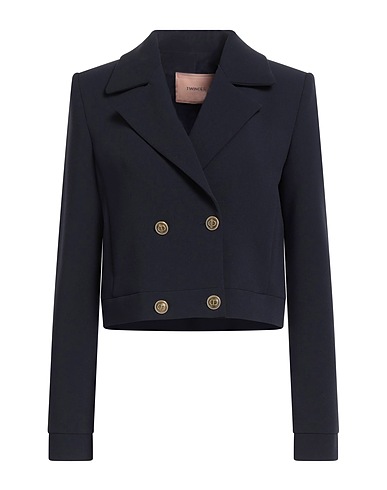 double-breasted blazer, crepe, solid color, no appliqués, lapel collar, long sleeves, shoulder pads, fully lined, button fastenings, slit pockets, stretch, dry clean, do not bleach, do not tumble dry