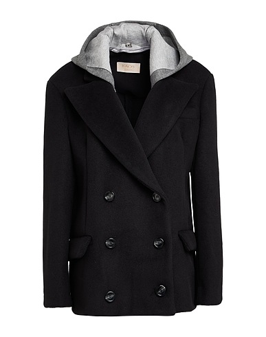 double-breasted coat, felt, no appliqués, two-tone, detachable hood, long sleeves, unlined, button fastenings, flap pockets, dry clean, do not tumble dry