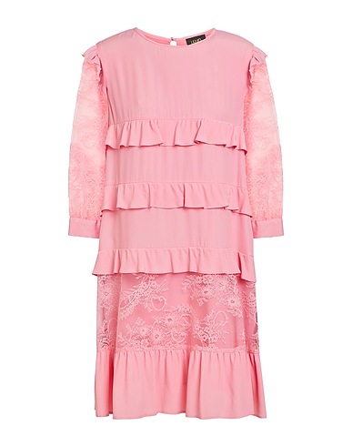 flared dress, crepe, lace, solid color, tiered, crewneck, 3/4 length sleeves, fully lined, button fastenings, without pockets, machine wash or dry clean, do not bleach, do not tumble dry