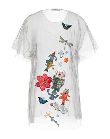 top, tulle, solid color with appliqués, embroidered, crewneck, short sleeves, hand wash, do not tumble dry