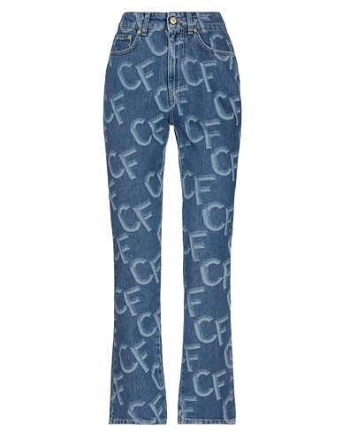 denim, logo, leather applications, logo design, medium wash, high waisted, front closure, button, zip, multipockets, contains non-textile parts of animal origin