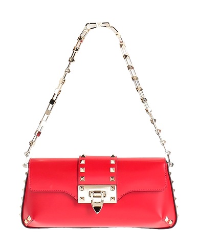 baguette bag, glossed-leather, solid color with appliqués, studs, framed closure, leather lining, bag handle, detachable shoulder strap, leather straps, medium size, contains non-textile parts of animal origin