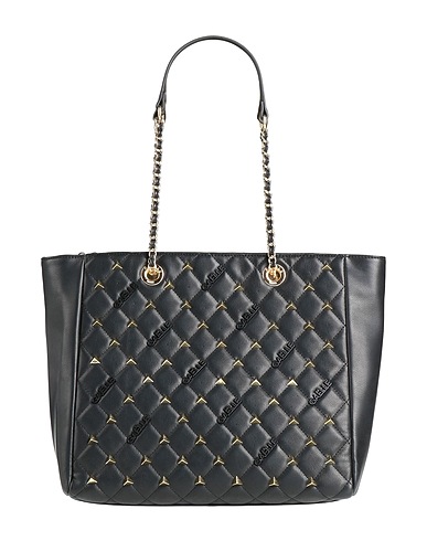 tote, synthetic material, solid color with appliqués, brand logo, studs, zipper fastening, fully lined, internal pockets, double handle, detachable shoulder strap, large size