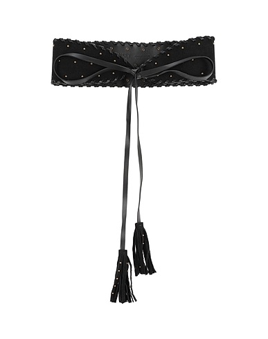 leather, suede effect, studs, logo, solid color, wide, self-tie wrap closure, contains non-textile parts of animal origin