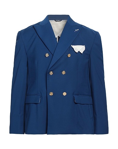 plain weave, no appliqués, solid color, lapel collar, double-breasted, long sleeves, partially lined interior, button closing, multipockets, dual back vents, stretch, double-breasted jacket