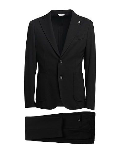single-breasted suit, jersey, stretchy fabric, solid color, no appliqués, lapel collar, long sleeves, buttoned cuffs, partially lined, button fastenings, multipockets, dual back vents, mid rise, belt loops, dry clean, do not bleach, do not tumble dry