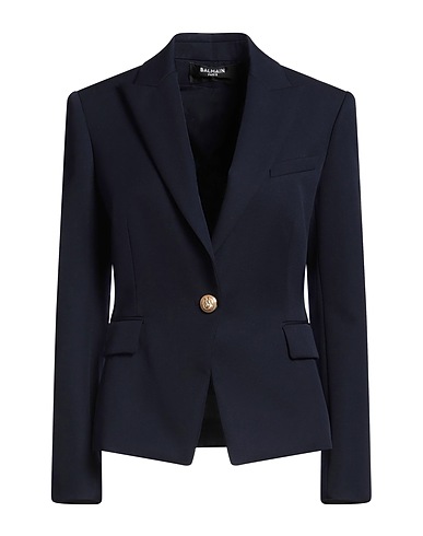 single-breasted blazer, wool, no appliqués, solid color, lapel collar, long sleeves, shoulder pads, buttoned cuffs, fully lined, 1 button, flap pockets, dry clean, do not bleach, do not tumble dry, this brand runs small